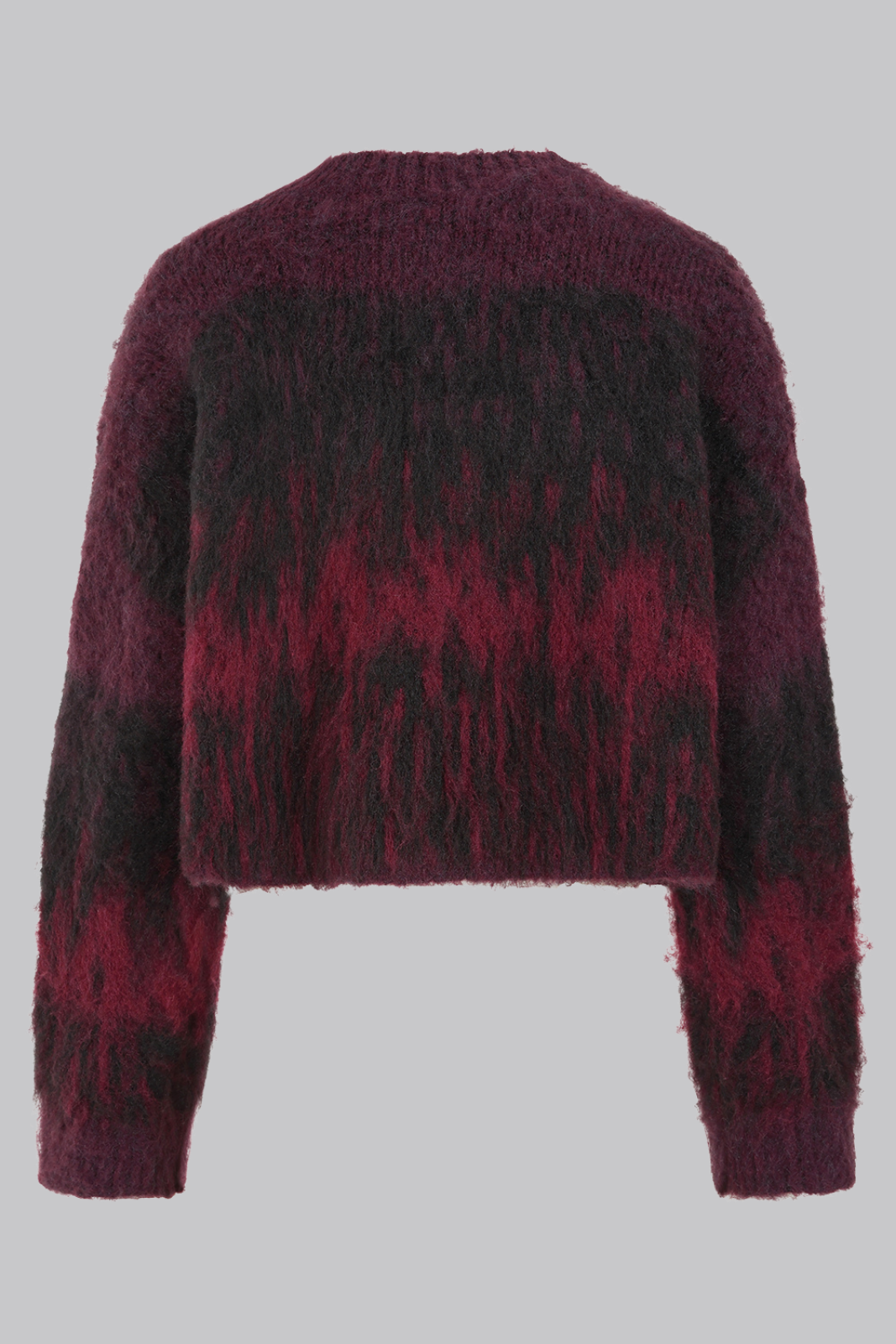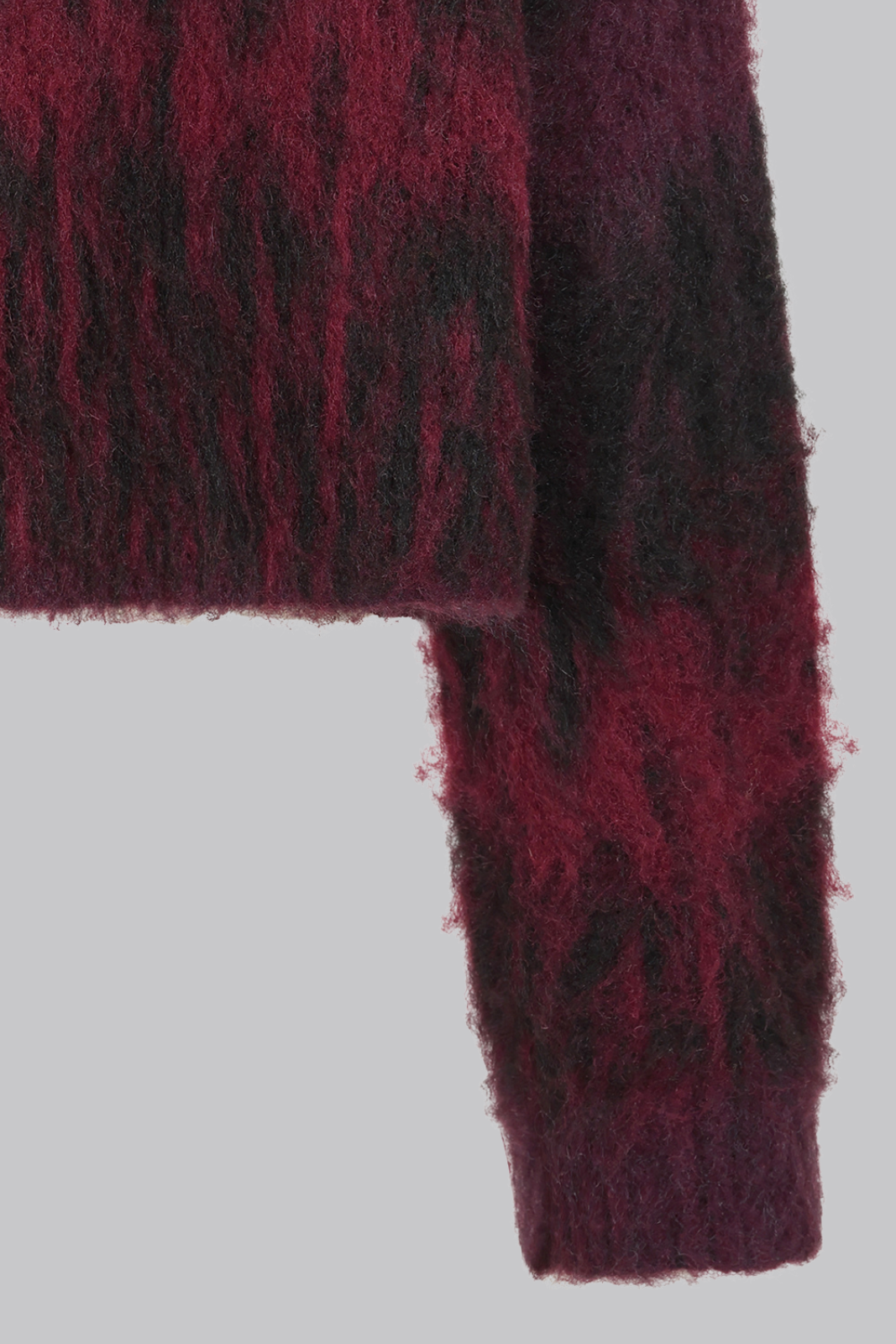 Serve cozy 90s goth realness in the Arwen Sweater. This fuzzy, ombre-effect knit blends rich black and blood-red tones in a cropped silhouette. Warning: you might never want to take it off.