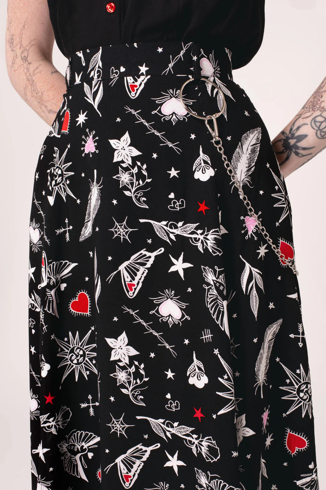 Bold, playful and a little bit rebellious. The Leah Skirt is a long midi skirt with an all-over tattoo-inspired print in white, pink and red on a black base. One of those pieces that instantly does the talking for you.